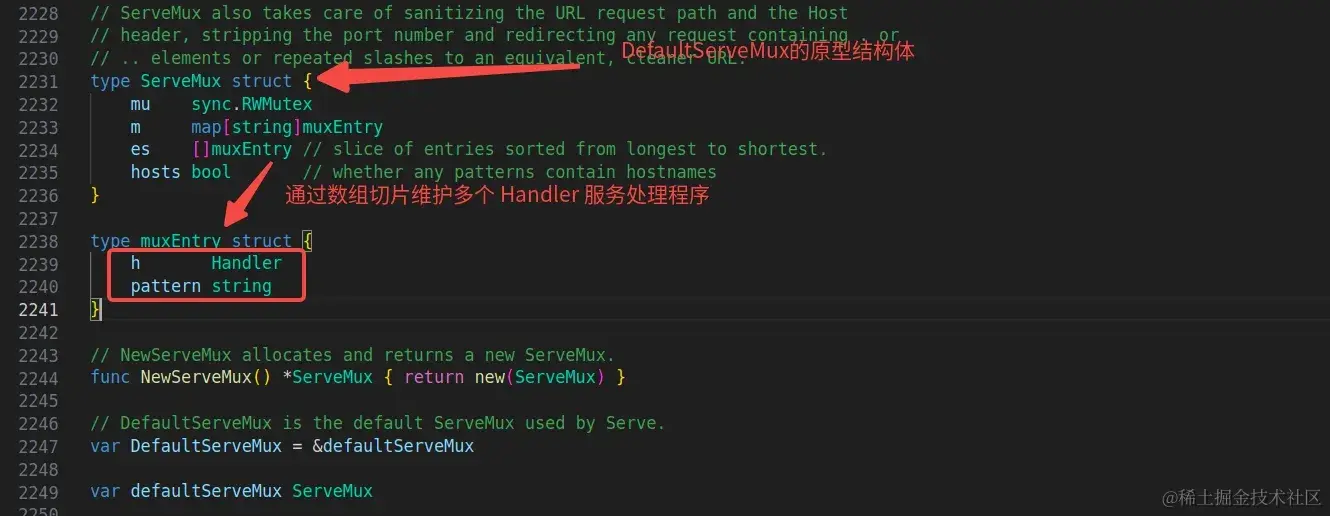 ListenAndServe() 函数源码中的解释是:如果 Handler 参数为nil 值时则使用 DefaultServeMux 全局锁。