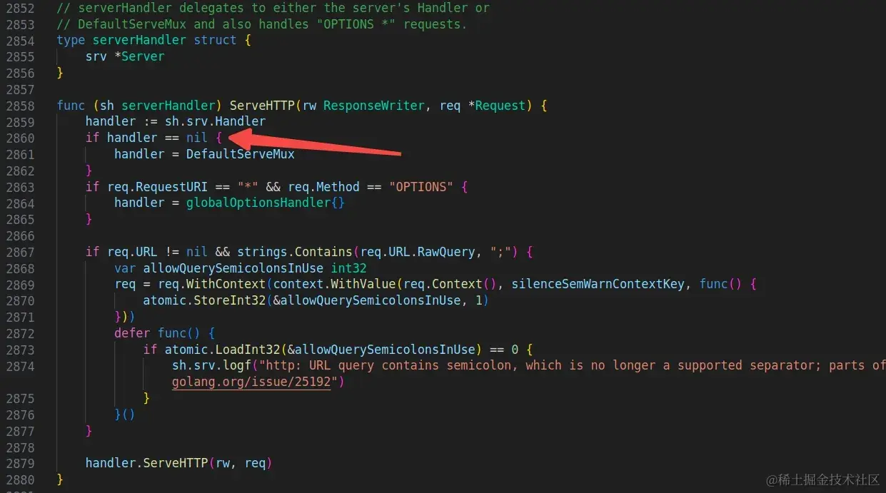 下图代码中就进行判断 handler 是不是nil值,如果是则使用 DefaultServeMux 所维护的 Handler 路由服务进行处理。