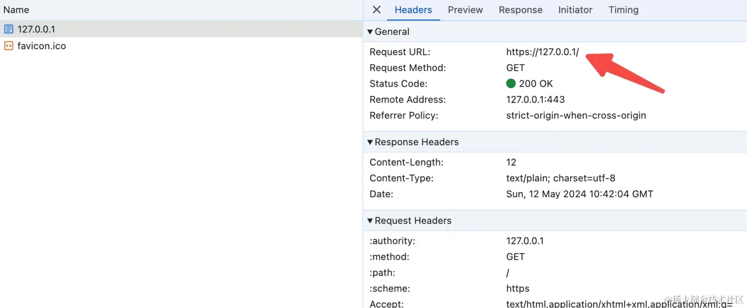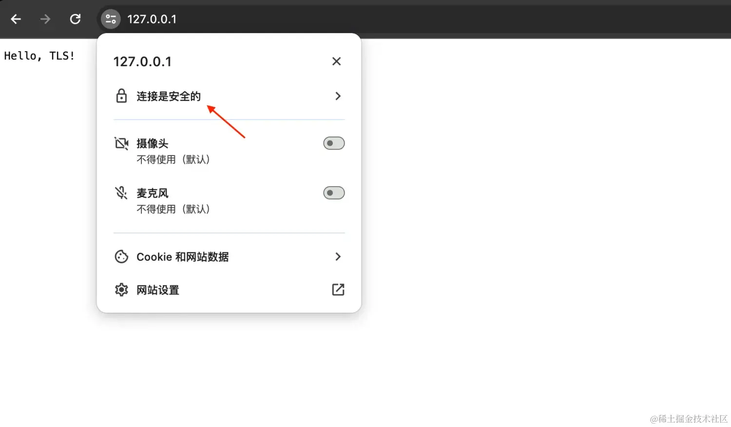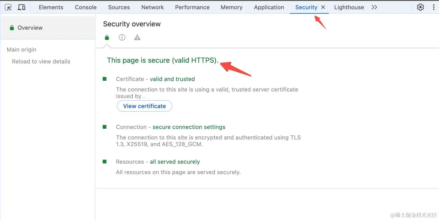 浏览器告诉我们,这次连接访问是安全的。 在浏览器开发调试模式下,也可以看到证书是安全的。