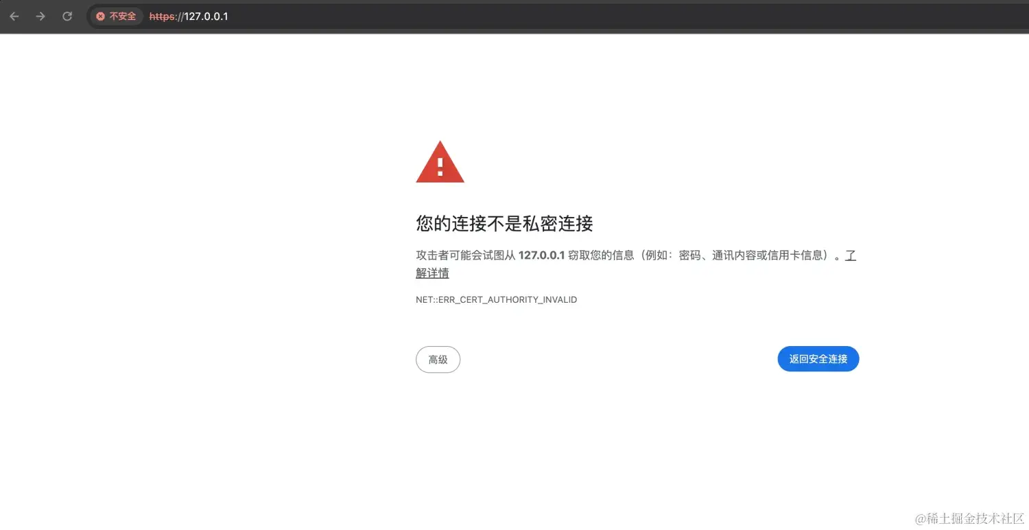 下面,我们运行程序后,在浏览器访问 https://127.0.0.1地址,发现浏览器警告这是一个不安全的连接,因为我们的证书没经过受信任机构处理。