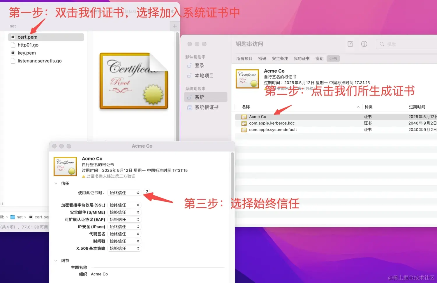 下面将所生成的证书加入到系统受信任区域,我所使用的是mac系统,下面操作根据系统步骤不太一样,大家可以根据系统自行搜索下。