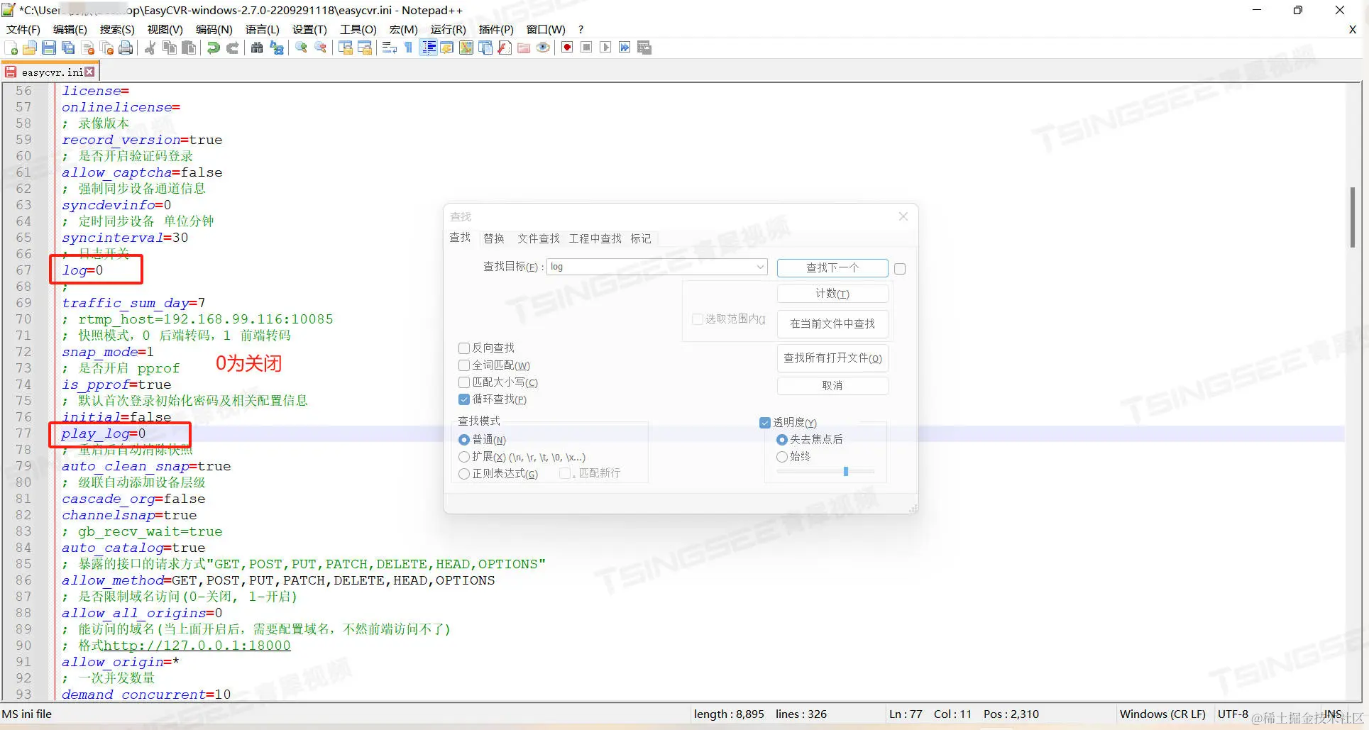 1)打开EasyCVR目录内的easycvr.ini配置文件并查找log关键词;