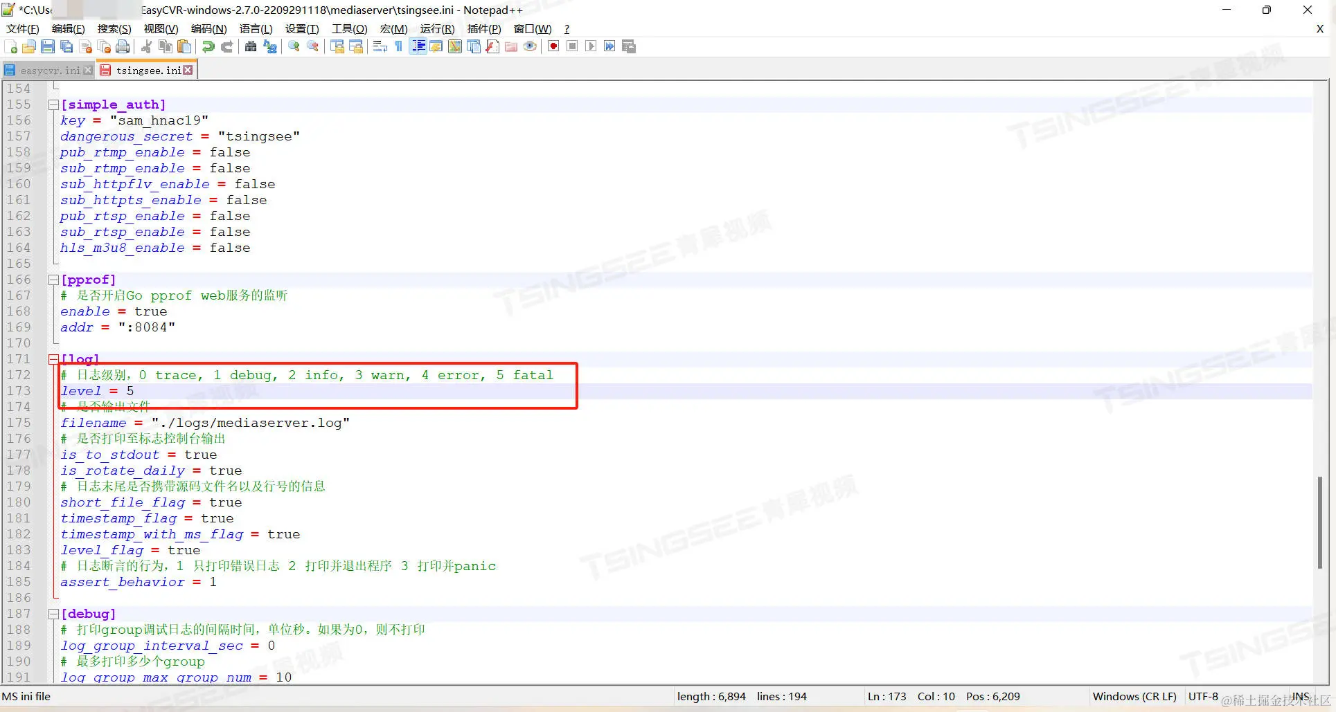 2)保存退出,进入到mediaserver目录打开tsingsee.ini配置文件,将log级别更改为5;