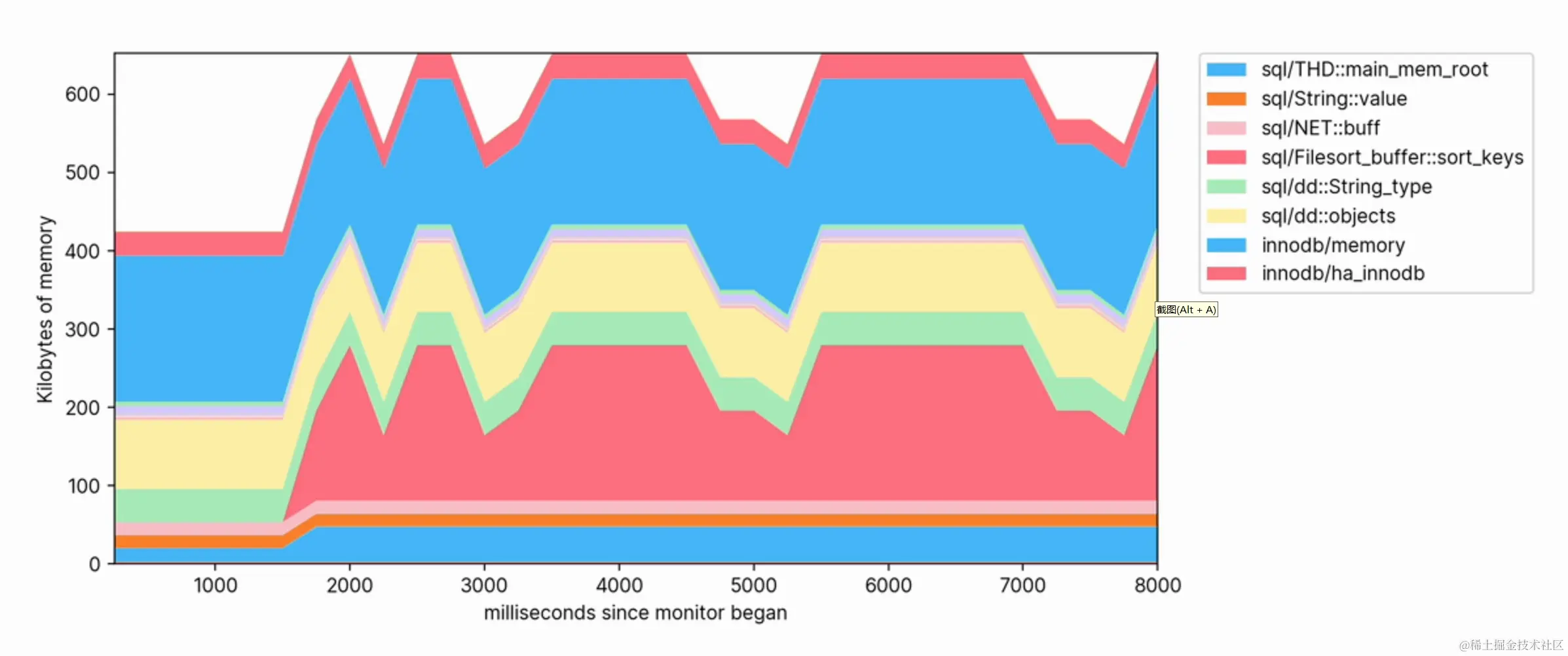 这指示执行此查询时每个类别正在使用的内存量。 如果在执行另一个 SELECT alias... 查询时多次运行此查询,您可能会看到结果有所不同,因为查询的内存使用量在其整个执行过程中不一定是恒定的。 该查询的每次执行都代表某个时刻的一个样本。 因此,如果我们想了解使用情况如何随时间变化,我们需要采集许多样本。