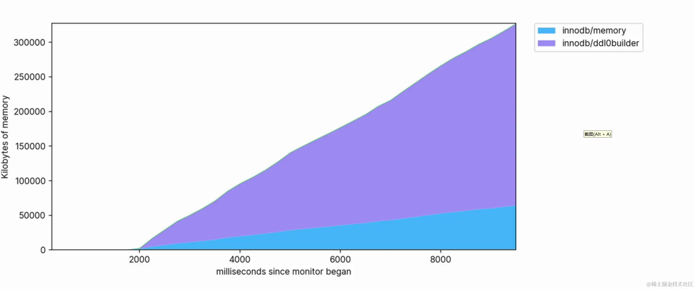 这种可视化还可以帮助我们清楚地看到哪些操作是占用内存的。 例如,以下是用于 FULLTEXT 在大型表上创建索引的内存配置文件的片段: