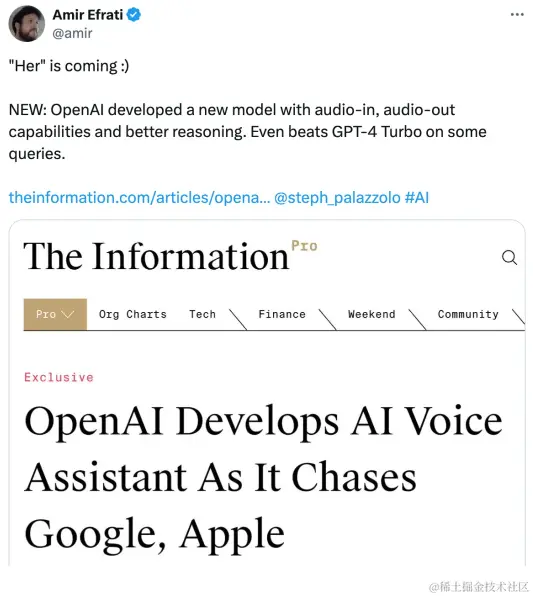 OpenAI 的葫芦里到底卖的什么药?据 The information 报道,OpenAI 开发了一款 AI 语音助手,具有音频输入、音频输出功能和更好的推理能力,甚至在某些方面击败了 GPT-4 Turbo。该 AI 语音助手很可能就在周一的这场直播中公开亮相。