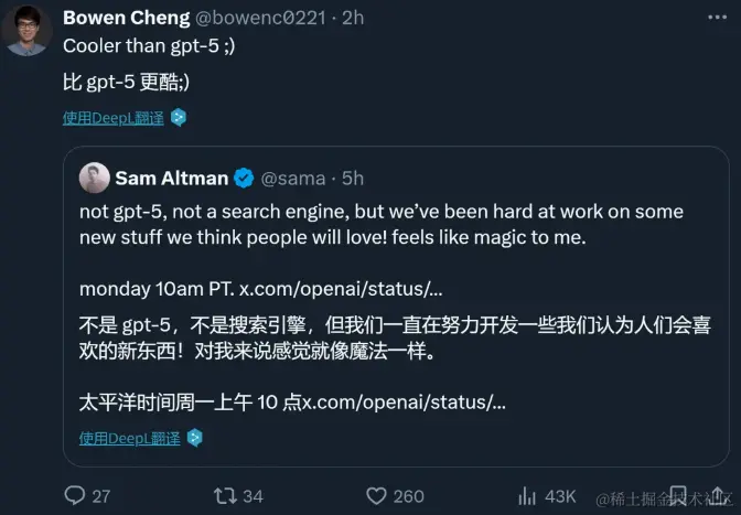 OpenAI 员工程博文(Bowen Cheng)跟了个帖,「比 gpt-5 更酷」,不过又迅速删帖。