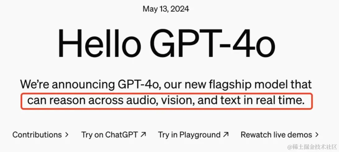 O代表OmniModel,就是全能模型的意思。我们看到官网上对于这个O的解释,这一次发布的GPT-4o是一个兼备实时音频、视频、图像、文本处理功能的全能助手。