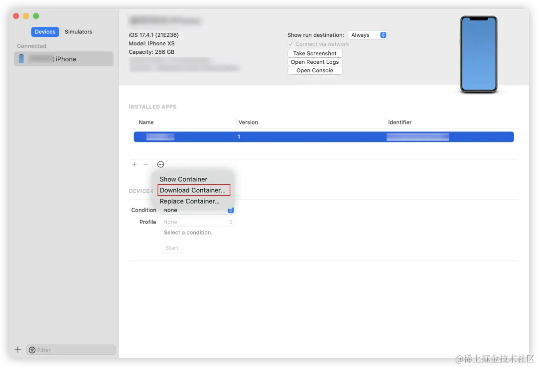 可通过Xcode -> Window -> Devices and Simulators -> 选中需要查看数据App应用 -> Download Container