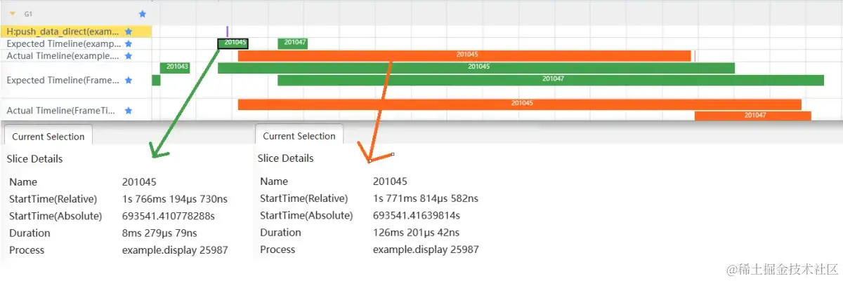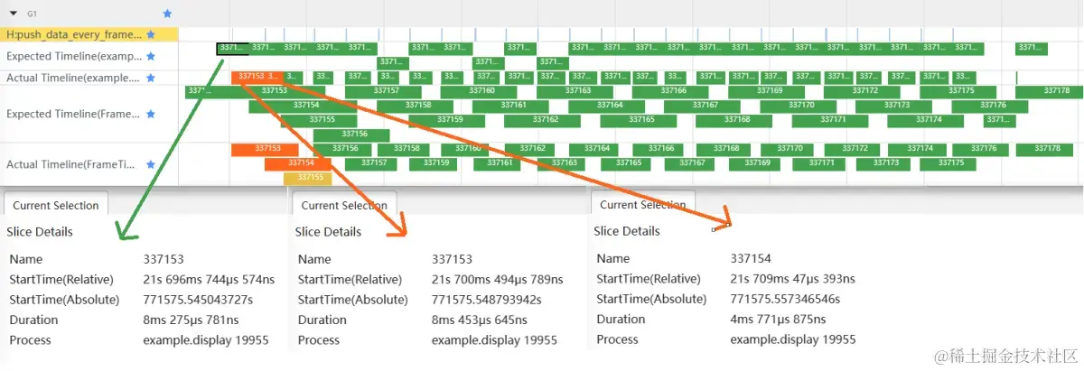 从图中可以看到,除了第1帧和第2帧有所延迟,其他的帧都没有问题。其中,第1帧实际耗时比期望耗时多158μs左右,时间上的影响很小;通过push_data_every_frame_half_month标签可以看到,第1帧运行到一半时才开始加载数据,导致了第2帧的结束时间比预期要晚一点,实际上第2帧的绘制时间只有不到5ms,对性能的影响也很小。