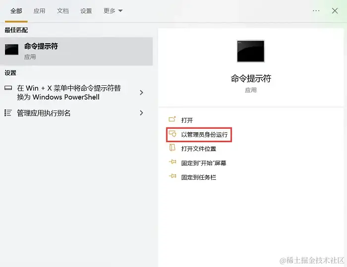 第一步:在Windows搜索栏中输入 “cmd” ,并以管理员身份运行命令提示符。