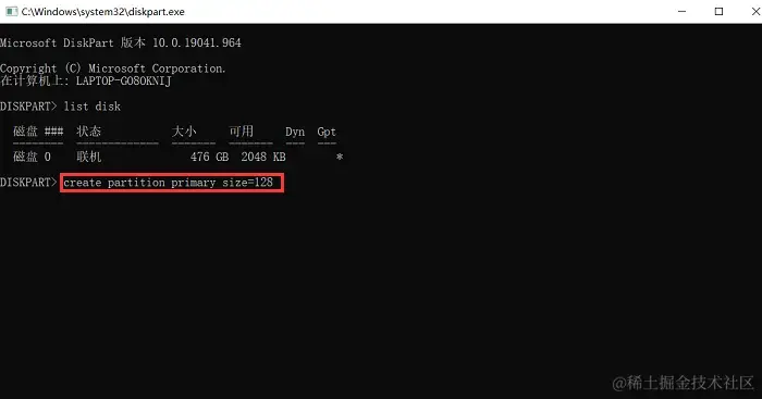 第三步:输入命令 “create partition primary size=128” 并回车。