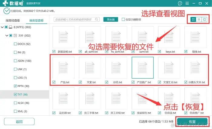 步骤4:定位到文件后,将需要恢复的文件勾选上,就可以点击【恢复】,并选择一个合理的文件保存位置,等待恢复完成。