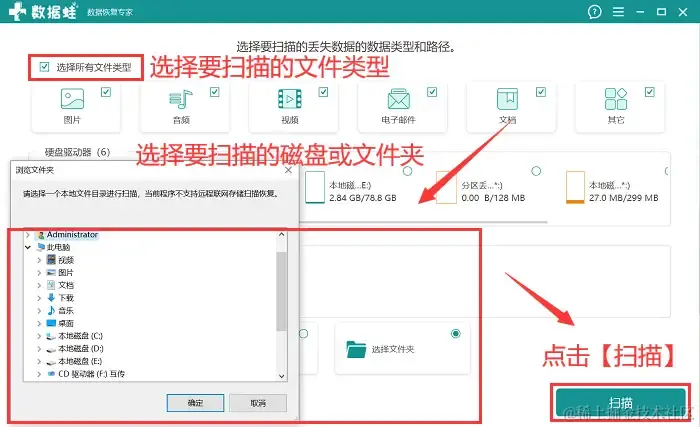 步骤2:在软件扫描的主界面,选择需要扫描的文件类型,同时选择要扫描的磁盘或者文件夹,单击【扫描】后耐心等待;