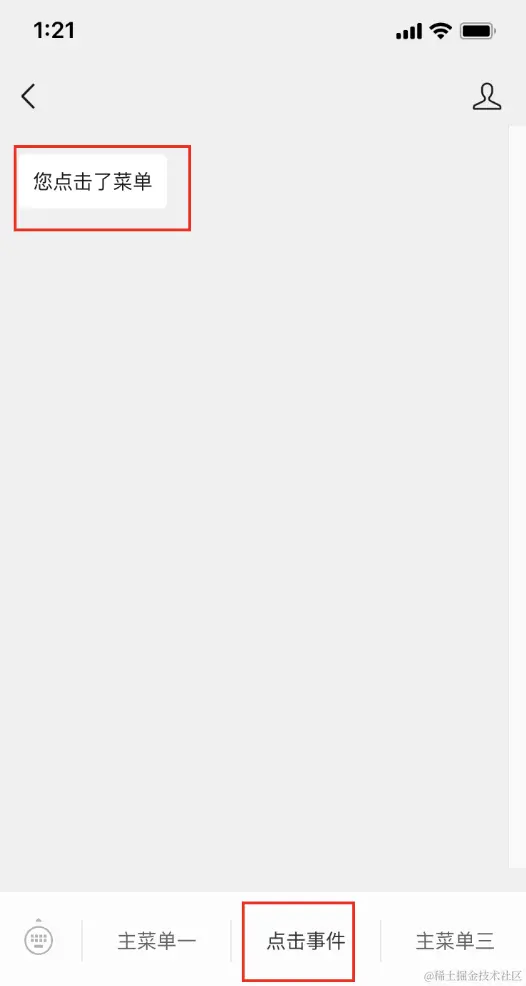 用户点击 点击事件 后,就会自动回复一条消息:您点击了菜单。