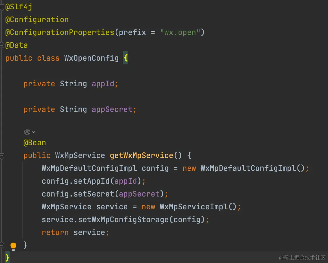 按照 WxJava 的规则,编写一个配置类,构建 WxMpService 的 Bean 实例,注入到 Spring 容器中。