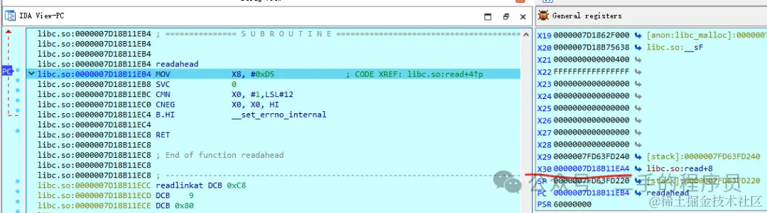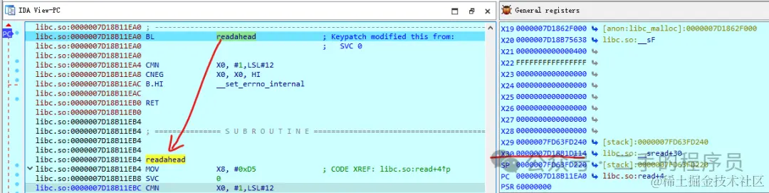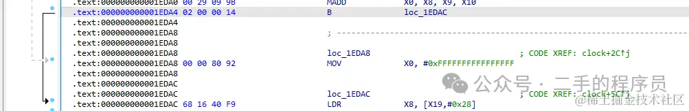 在 000000000001EDA4 处有一条 B 指令,执行完该指令之后就会直接跳转到 000000000001EDAC 处,IDA使用一条带箭头的线给出了提示。