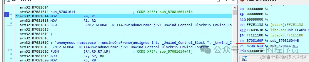 看到,LR 寄存器的值变成了 0xB708160F ,这是一个奇数,指令的地址不可能是一个奇数。它的值是 B708160E 的值加上1,这个1表示当从函数跳转回来继续执行的时候,需要以 thumb 模式来执行。