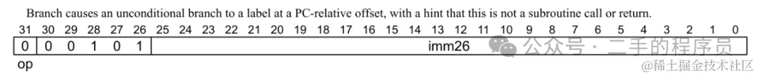 B指令是无条件跳转指令。看描述是一个相对于PC地址的跳转,范围是使用 imm26 来描述。26 位表示的范围是 +/-128M。为啥会是 128M 呢?是因为最后的值还需要乘以4。