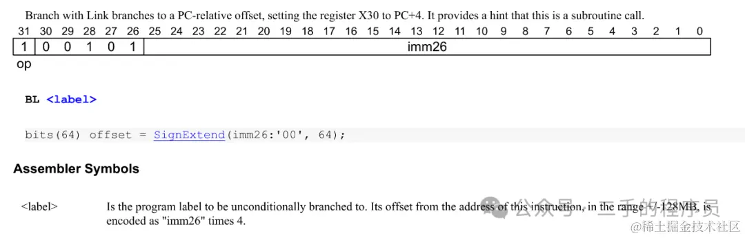 但是在 v8 中,offset 就直接是 imm26 的值,这是否说明在 v8 中,pc就是自身的值?暂时未找到具体文档,先留个疑问。