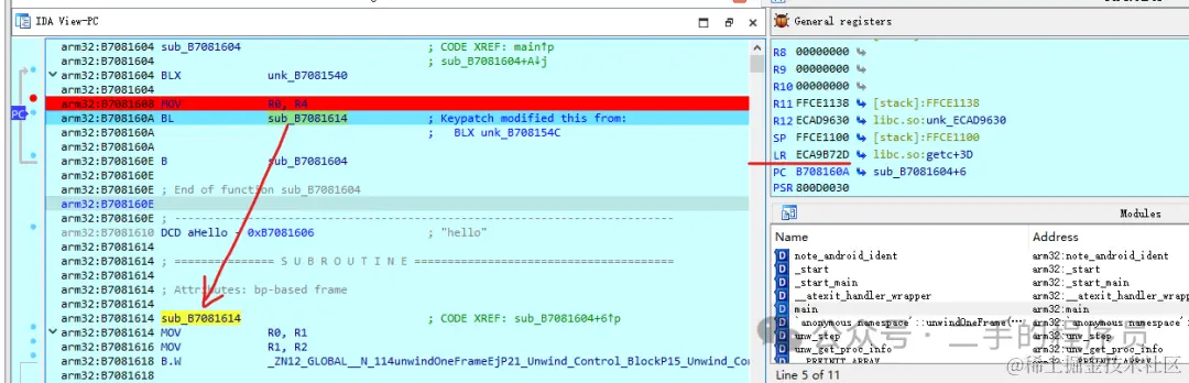 - v7中的模式切换,arm切thumb,thumb切arm。理解了模式切换就会明白为什么在做 inline hook 时,有些地址需要加上1,加上 1 的作用是什么。