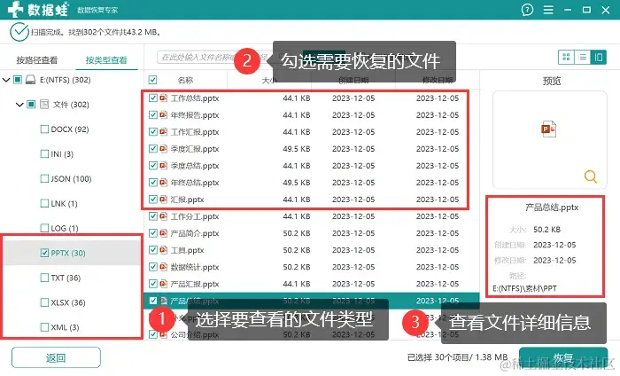 步骤3:耐心等待扫描完成,软件将呈现扫描到的所有结果,用户可以选择需要查看的文件类型,并在右侧根据文件名称等条件对需要恢复的数据进行勾选;