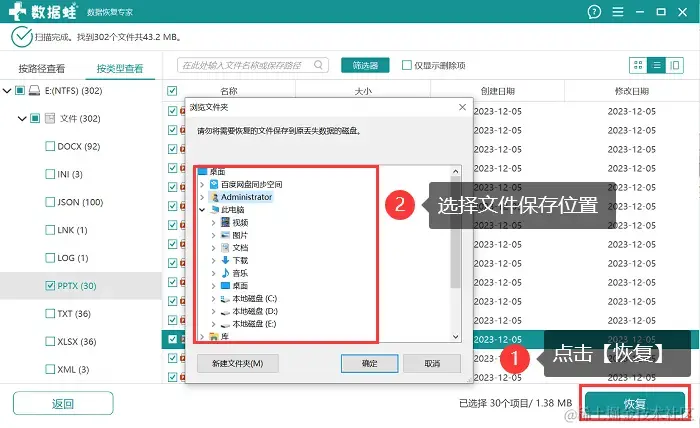 步骤4:将所有需要恢复的文件都勾选完毕后,点击【恢复】,并选择一个与扫描位置不一样的磁盘来保存文件。