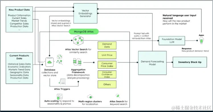MongoDB 可以让这些过程更轻松地实现。在仓库中,可以使用移动设备扫描库存,并将这些数据持久化到MongoDB中,并使用Device Sync同步到MongoDB(此方案已有MongoDB客户在使用,如Grainger)。**一旦数据进入MongoDB,它就可以作为所有库存相关数据的中央存储库,同时为AI应用程序提供数据来源,从而消除数据孤岛,提高整体库存水平和动态的可见性。**通过使用MongoDB 的Vector Search和Gen AI,制造商可以轻松地根据时令属性对产品进行分类,对具有相似时令需求模式的产品进行聚类,并为基础模型提供上下文,从而提高库存的综合数据生成的准确性。