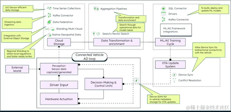 汽车应用中基于AI的图像和目标识别存在不确定性,但制造商仍然要利用雷达、激光雷达、摄像头和车辆遥测数据来不断进行模型训练。现代汽车就像一个数据中心,不断收集和处理来自车载传感器和摄像头的信息,从而产生大量的数据。强大的存储和分析能力对于管理这些数据至关重要,而实时分析对于作出即时决策以确保安全导航至关重要。MongoDB可以在这些挑战面前发挥重要作用。