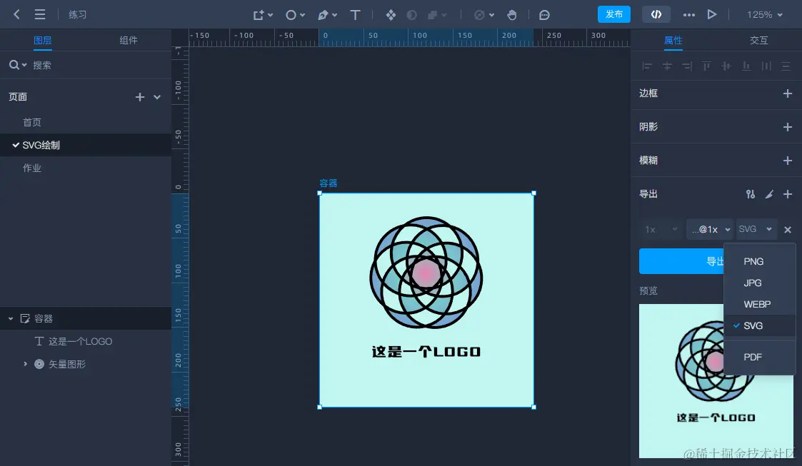 7、如果图形由多个元素组成,可以将它们组合在一起或分组,以便整体移动或编辑。完成设计后,为当前画板添加导出标记,并设置导出的格式为SVG。