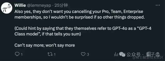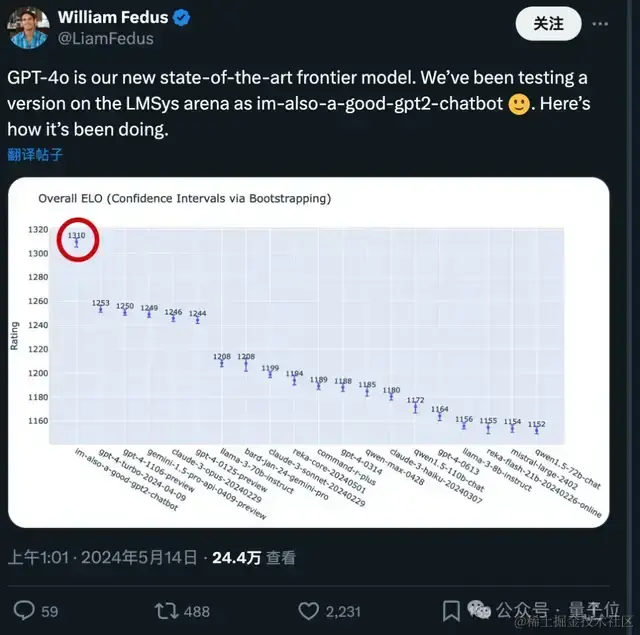 在场外,研究员 William Fedus 揭秘,GPT-4o 就是之前在大模型竞技场搞 A/B 测试的模型之一,im-also-a-good-gpt2-chatbot。