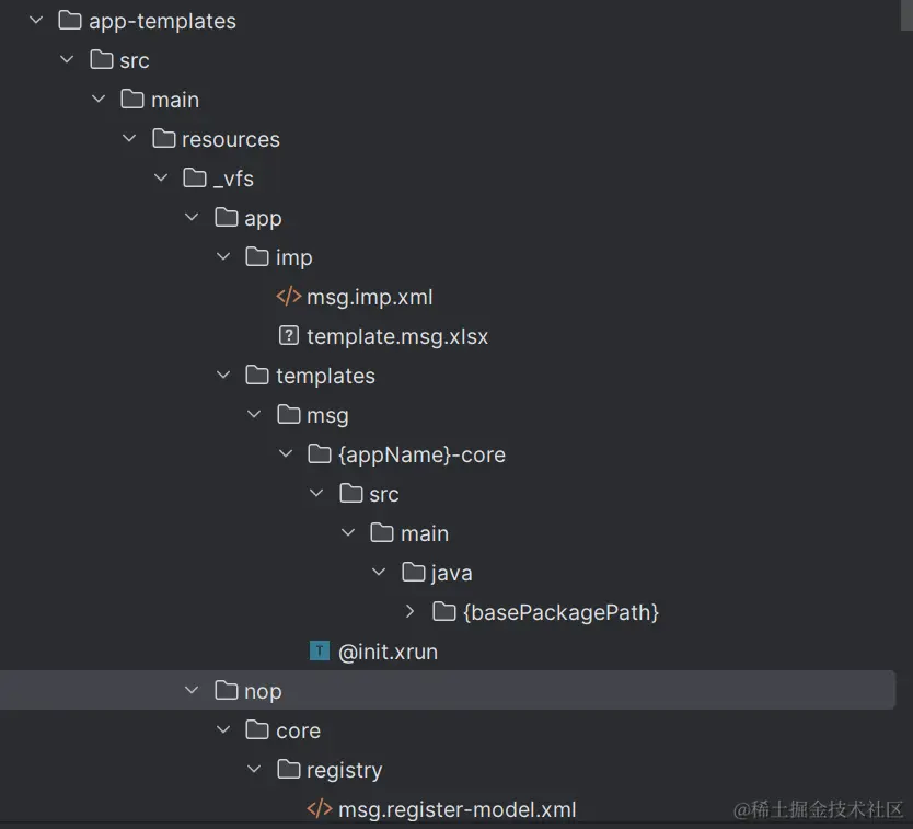 为了让Nop平台的模型加载器识别msg.xlsx这样的文件后缀名,实现对模型的自动加载和解析,我们需要定义增加一个注册模型,即上面的msg.register-model.xml。