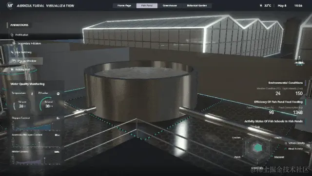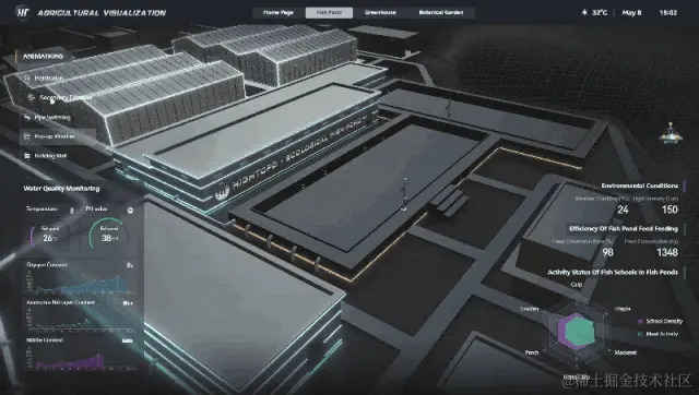 图扑软件应用自研 HT for Web 产品,打造轻量化智慧生态鱼塘可视化解决方案。页面整体以工业金属风格为主,采用 PBR 材质技术,精细打造鱼塘场景,实现水质透明、鱼类生动的高度逼真渲染效果。