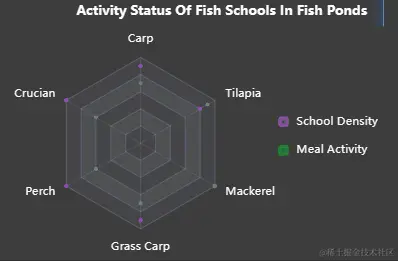 雷达图中每一个轴代表一种鱼类,轴上的点表示该类鱼在鱼塘中的密度或餐食活动的数据点。这样多轴的图形可以同时展示多个维度的数据,使得用户迅速掌握各鱼种在特定时间内的状态和活动水平。 例如,高密度的点反映某种鱼群数量,而餐食活动的数据点则揭示进食频次和量。高频率和大量的进食活动表示鱼群健康活跃且食物充足。