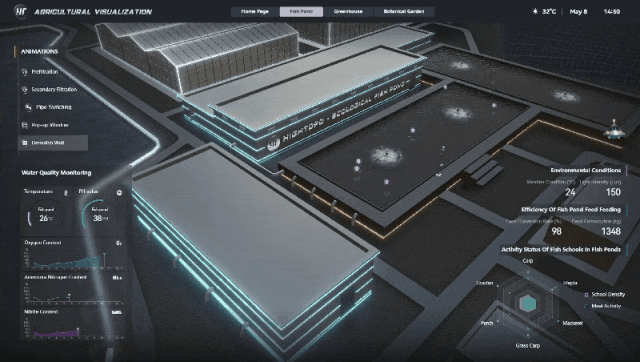 通过这些实时监测和分析,图扑 HT 生态鱼塘可视化系统,不仅帮助用户实时了解鱼塘内鱼群的总体健康状况,还能为饲料投放、水质管理等养殖决策提供数据支持,从而更有效地提高养殖效率和鱼类的生长健康状况。