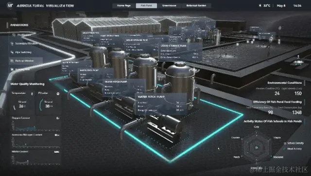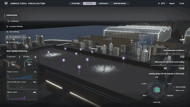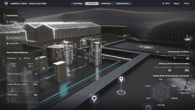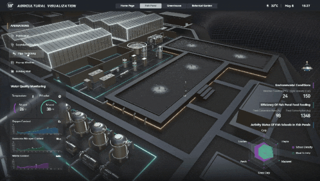 场景通过部署多种传感器,实现在两侧 2D 面板处实时水温、pH 值、溶解氧等关键指标以及鱼群动态, 这些信息被无线传输至 3D 可视化监控平台内。同时,点击 3D 场景内设备属性显示/隐藏按钮, 即可一键查看鱼塘内所有设备参数属性。