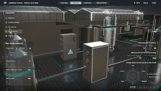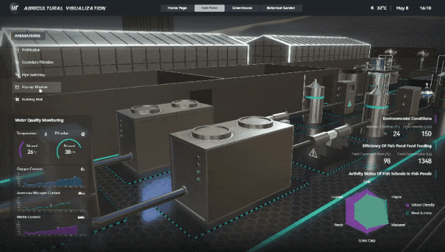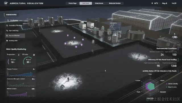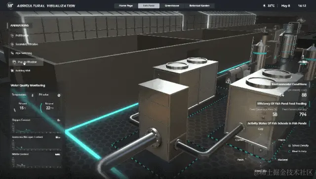 生态鱼塘的二次过滤系统是一个高效、多阶段的水质净化和维护系统。通过物化生一系列过程去除水中的悬浮物、有机物、氮氨化合物和病原体,同时调整水温,确保水质清洁、稳定,并满足鱼类健康生长的需求。应用图扑软件 HT 数字孪生技术高精度模拟复现物理环境整体过滤系统运行状态。从二次过滤系统全局调度、到各分段作业流程操作、再到各机械设备工况参数等多层面监测。