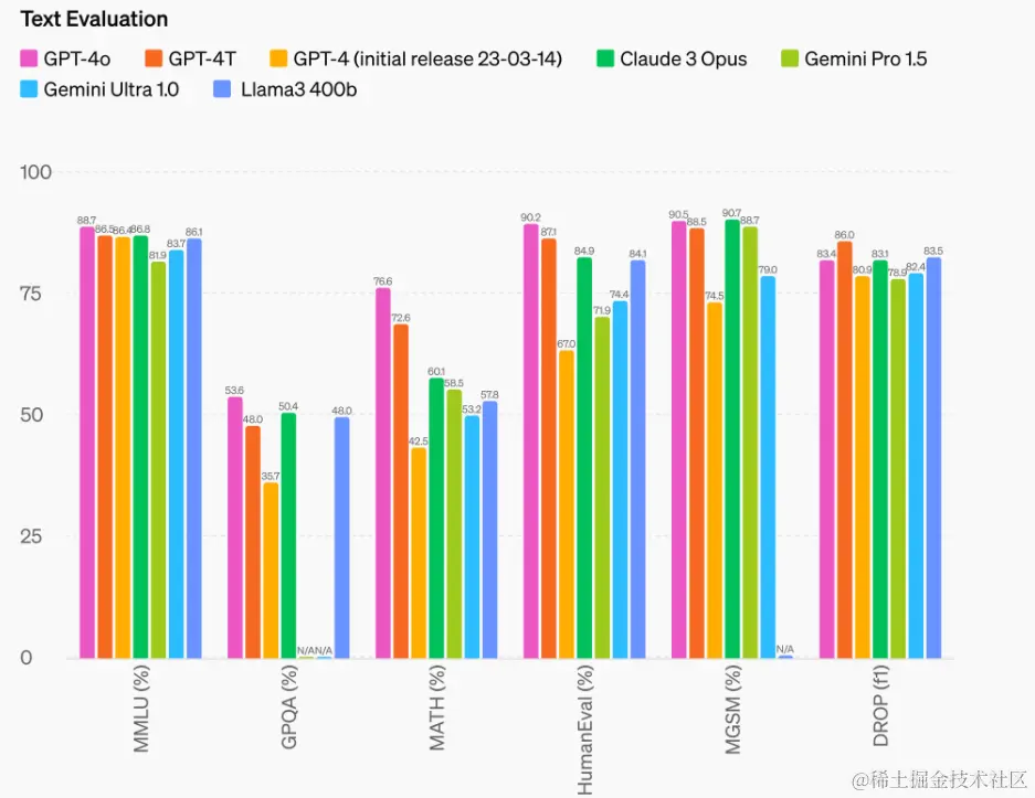 改进的推理能力 - GPT-4o在0-shot COT MMLU(常规知识问答)上设定了新的高分,达到了88.7%。所有这些评估都是通过我们新的简易评估库收集的。此外,在传统的5-shot no-CoT MMLU上,GPT-4o也设定了新的高分,达到了87.2%。(注:Llama3 400b仍在训练中)