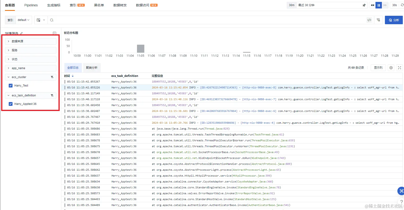 可以通过观测云的日志查看器快速查看日志信息包括支持信息模糊查询,正则表达式查询等。也可以通过不同的过滤条件来对日志信息进行直接的筛选查看。如下图所示:
