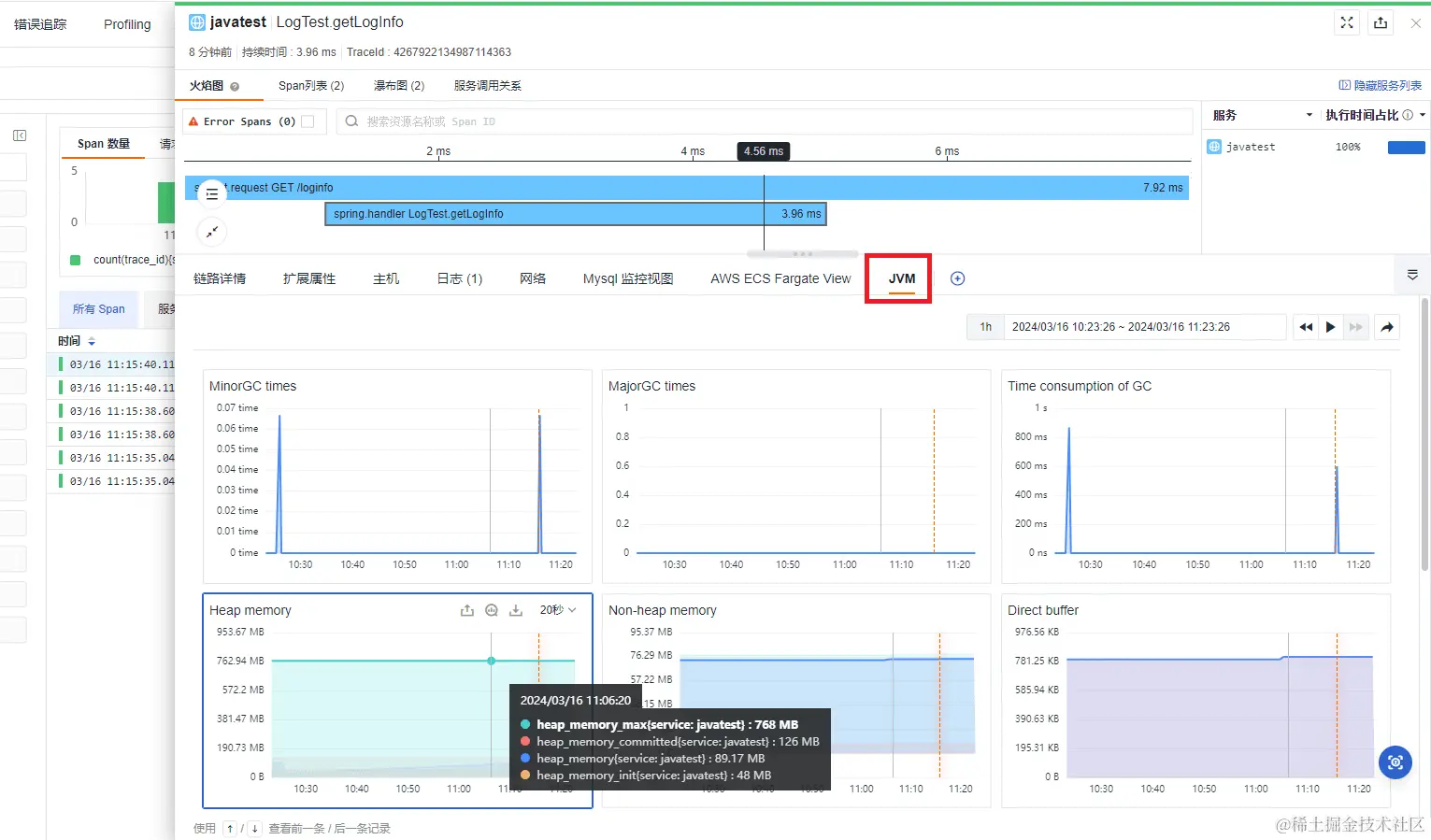 如果是 Java 应用,也可以快速关联 JVM 的运行指标情况。帮助用户快速了解服务调用时,JVM 的运行情况是否有异常,如下图所示: