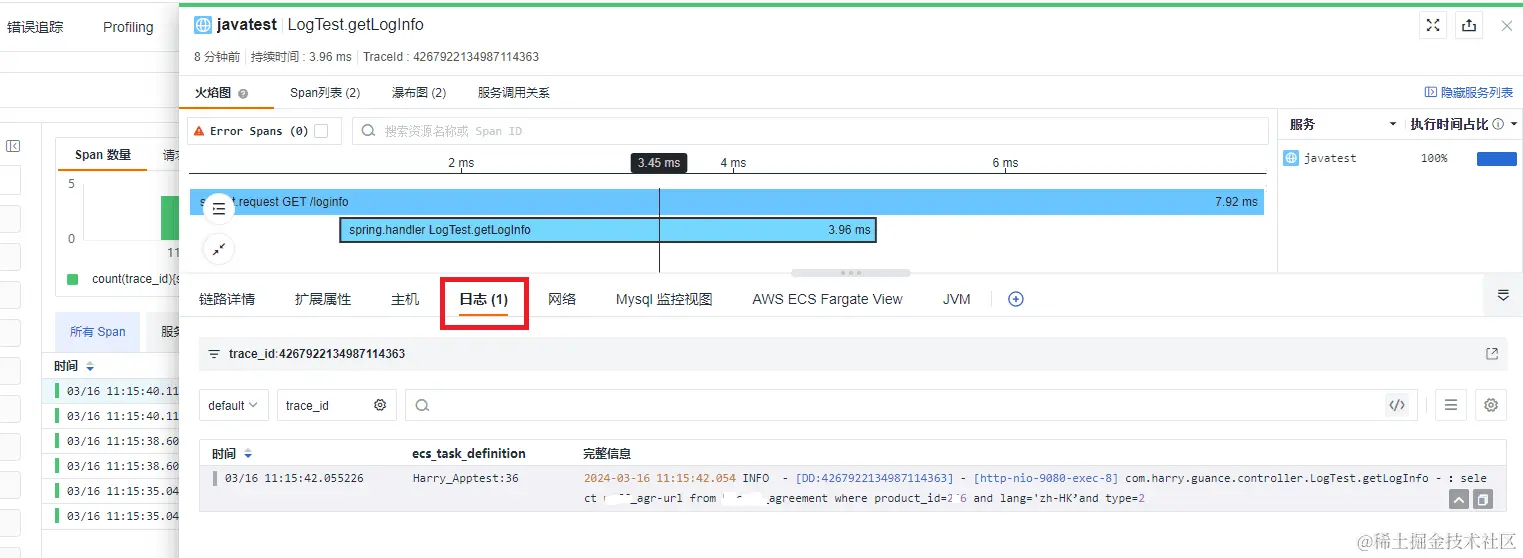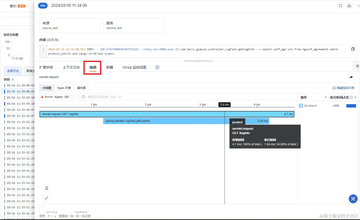 同时,在查看日志详情的过程中,如果用户想进一步了解产生该日志的链路信息,观测云也提供日志详细页面直接关联到对应链路的能力。如下图所示: