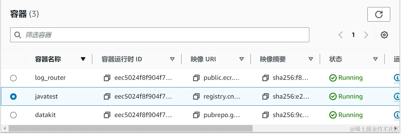 基于新创建的任务定义创建 ECS Fargate 服务。服务成功启动后,将看到如下的三个在运行状态的容器: