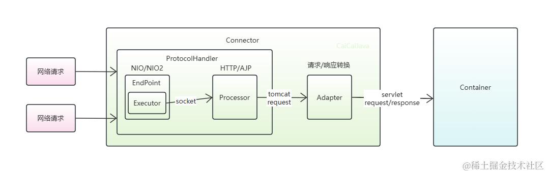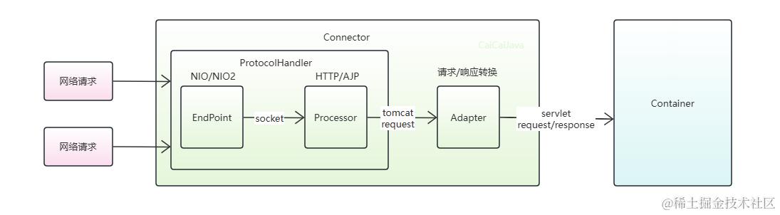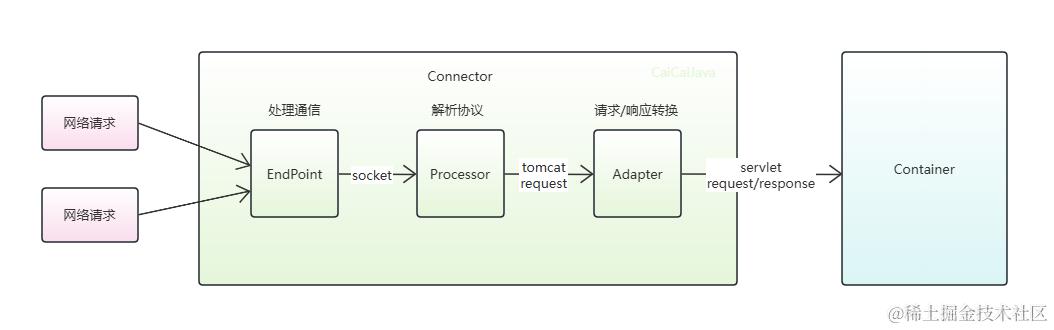 Processor解析流封装的请求/响应是Tomcat中定义的,Adapter将请求/响应转化为Servlet的请求/响应,方便后续容器进行处理