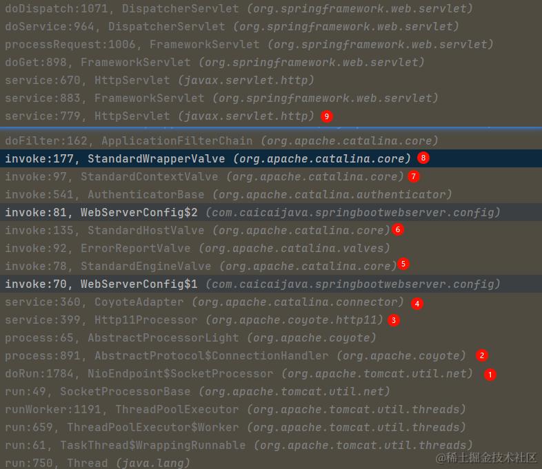 getAdapter().service(request, response) - 适配器Adapter封装完请求/响应(会使用加载器解析请求映射),最后从Engine的职责链First开始调用