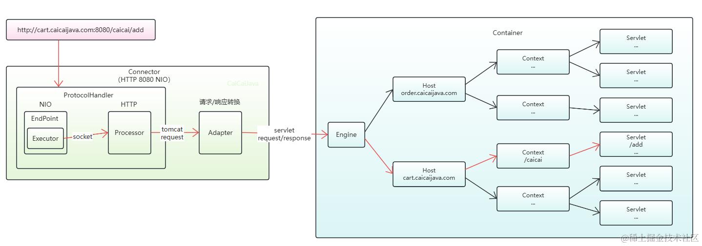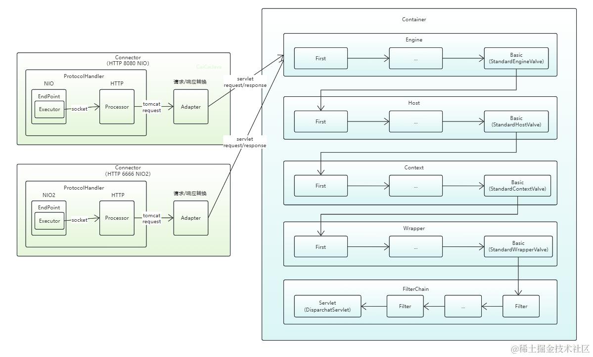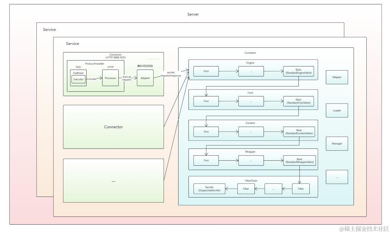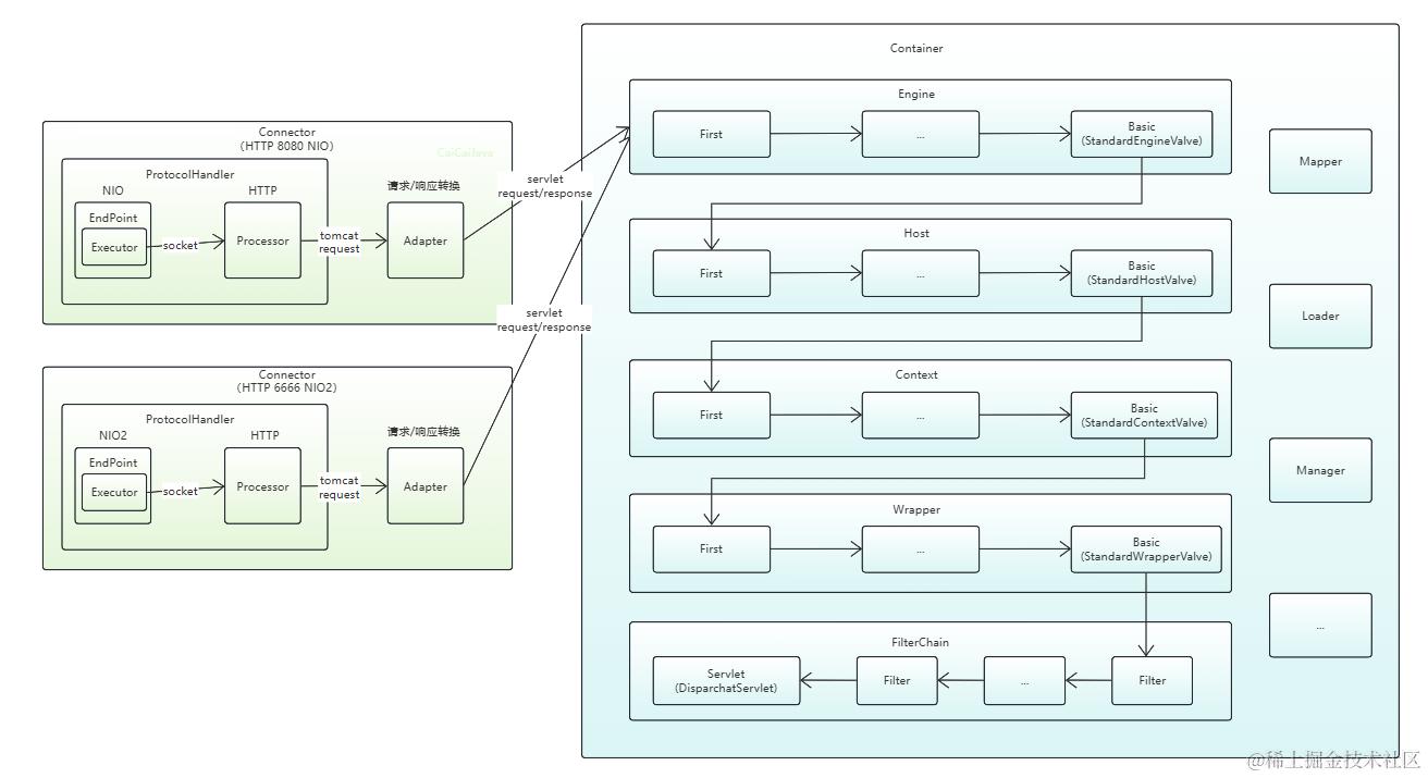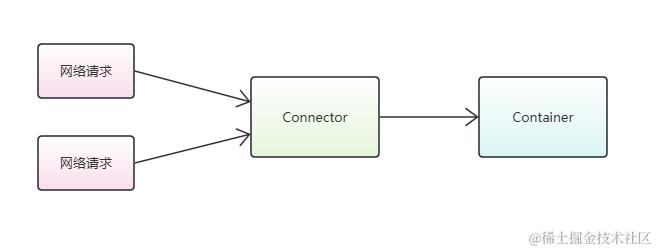 首先请求会经过连接器进行处理,连接器处理完将请求交给顶级容器Engine