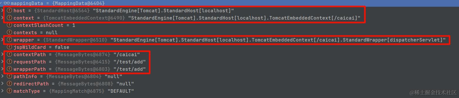 而Context则是配置的contextPath:/caicai,其实现类是Spring Boot继承StandardContext的TomcatEmbeddedContext