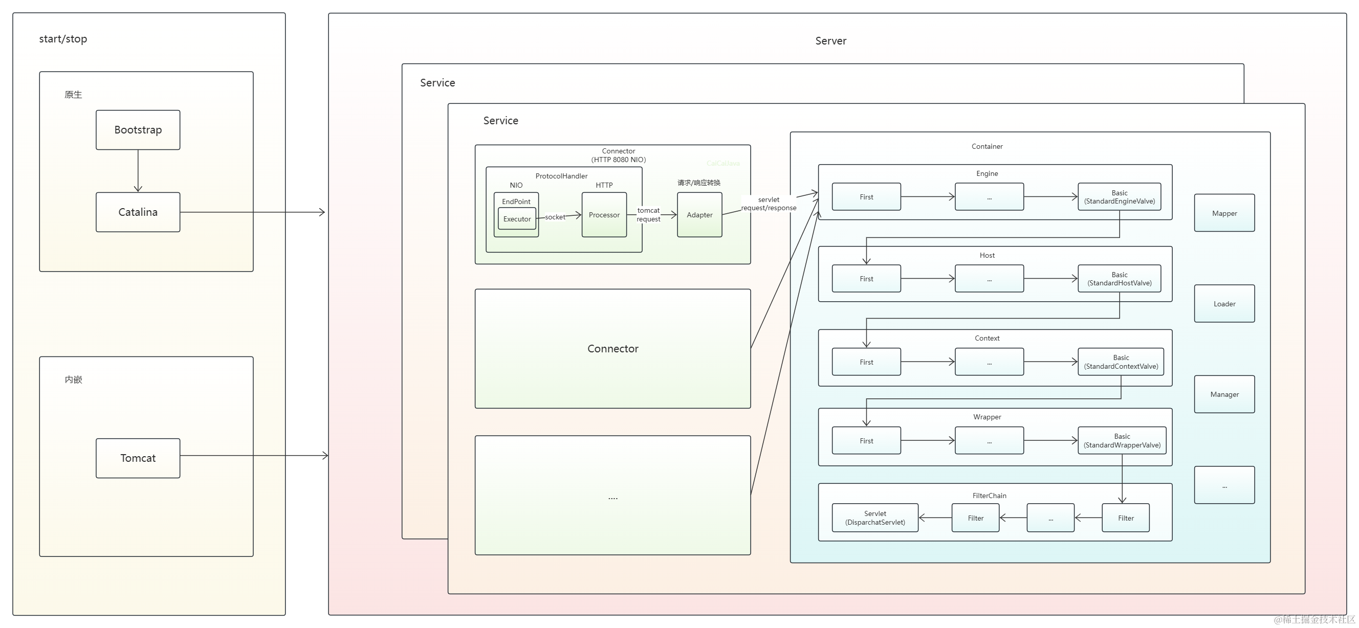 在容器运行时还包含其他组件,如提供类加载的加载器Loader、管理session的管理器Manager...