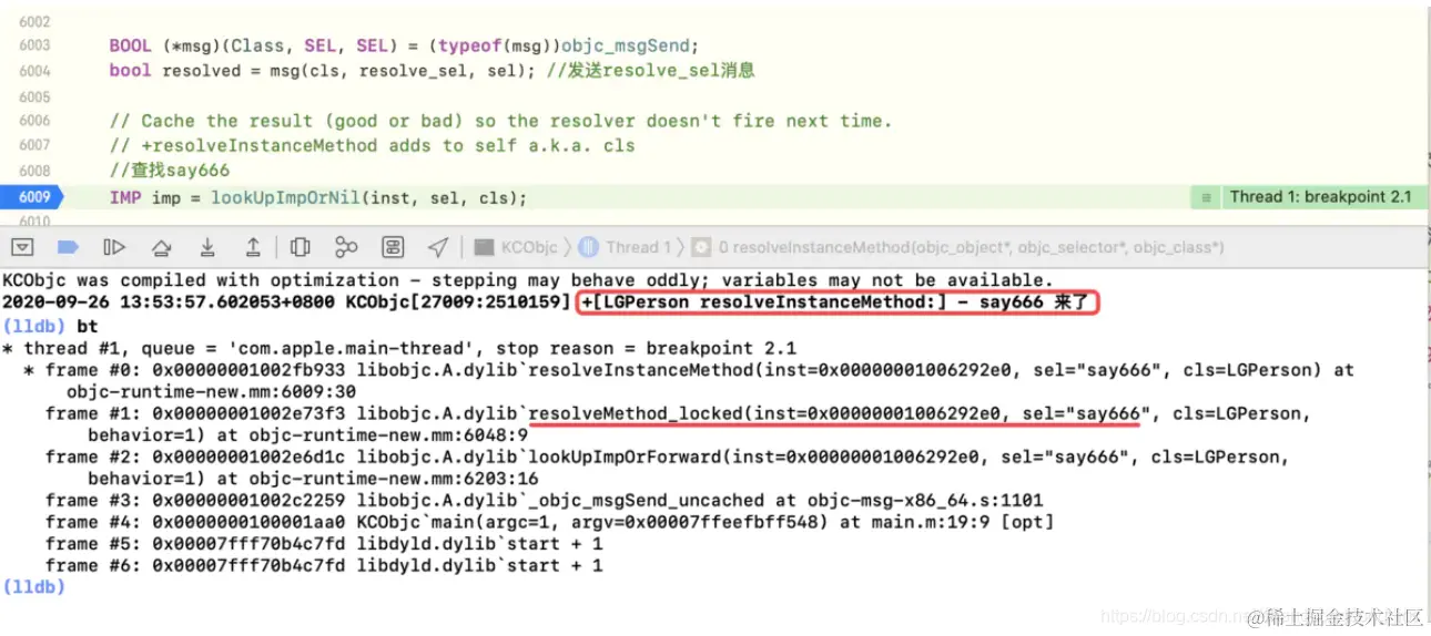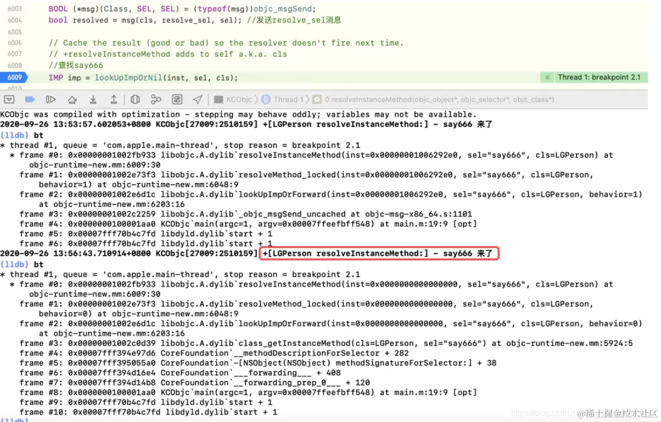 resolveInstanceMethod方法中IMP imp = lookUpImpOrNil(inst, sel, cls);处加一个断点,运行程序,直到第一次“来了”,通过bt查看第一次动态方法决议的堆栈信息,此时的sel是say666 -