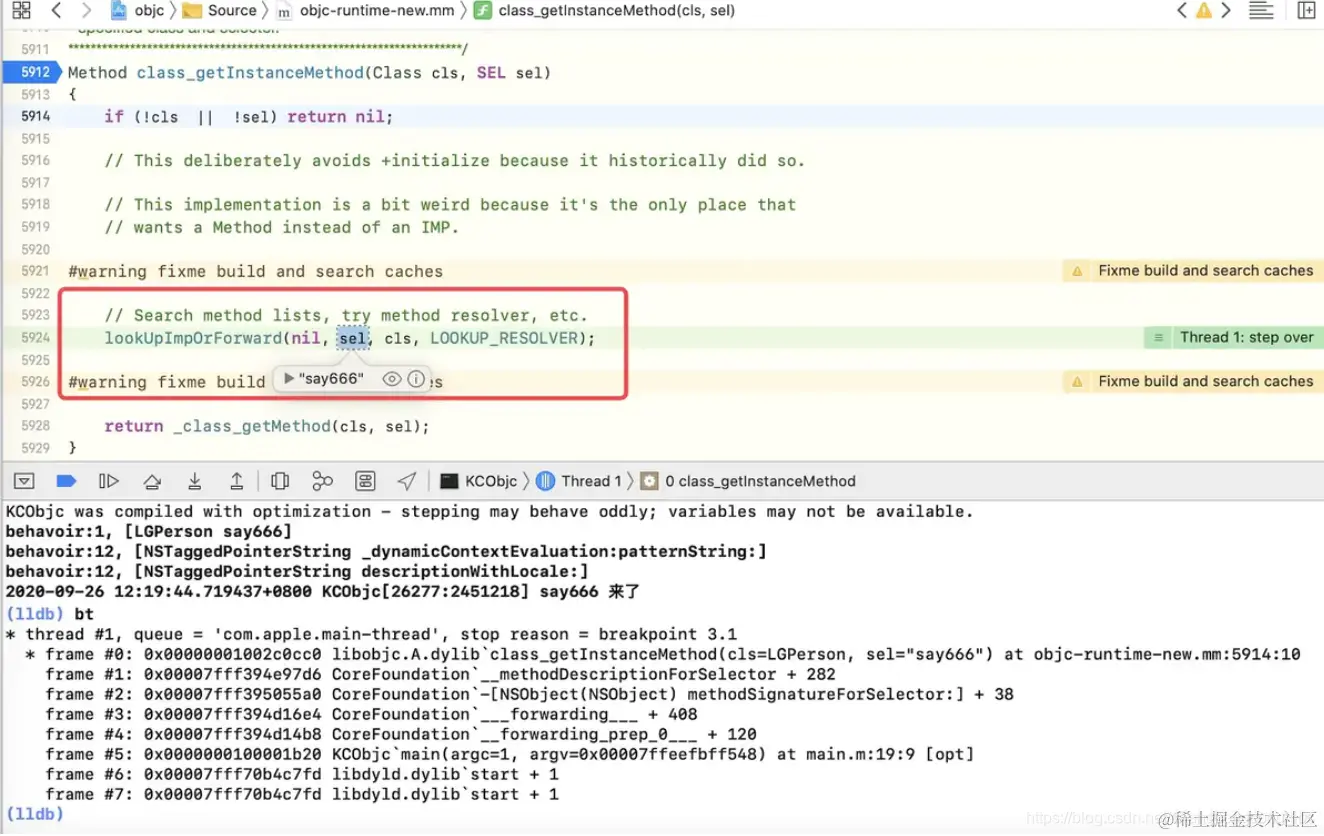 这一点可以通过代码调试来验证,如下所示,在class_getInstanceMethod方法处加一个断点,在执行了methodSignatureForSelector方法后,返回了签名,说明方法签名是生效的,苹果在走到invocation之前,给了开发者一次机会再去查询,所以走到class_getInstanceMethod这里,又去走了一遍方法查询say666,然后会再次走到动态方法决议