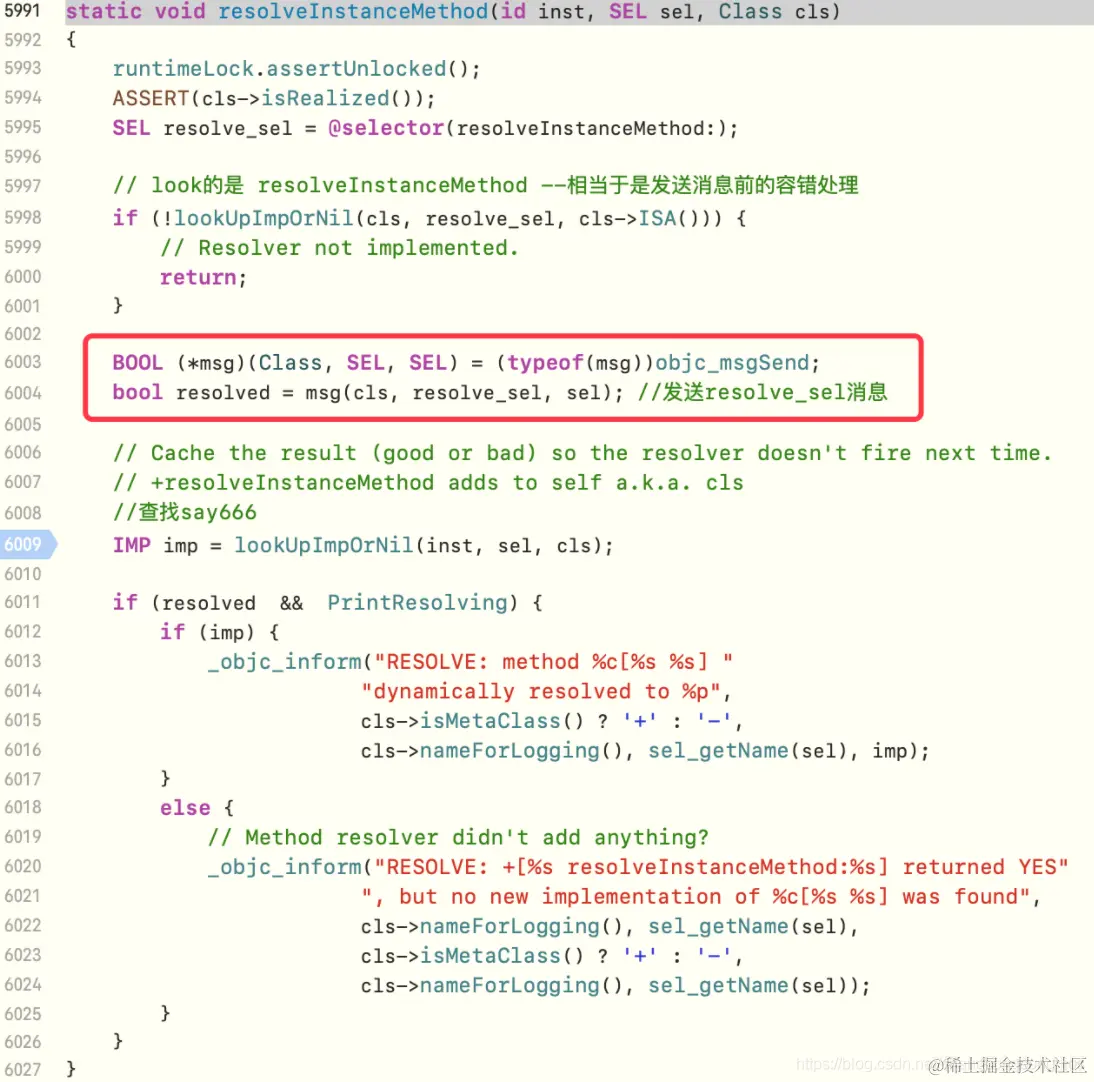 在慢速查找流程中,我们了解到resolveInstanceMethod方法的执行是通过lookUpImpOrForward --> resolveMethod_locked --> resolveInstanceMethod来到resolveInstanceMethod源码,在源码中通过发送resolve_sel消息触发,如下所示